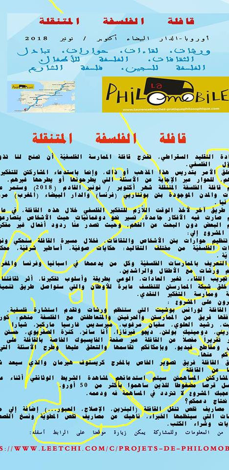 Ce voyage aura pour point de départ Pontarlier et Casablanca pour point d’arrivée. La philomobile s'arrêtera à Besançon, Saint-Lupicin, la Pesse, Dullin, Saint Laurent des Arbres, Pont Saint Esprit, Perpignan, Elne, Ceret, Saragosse, Madrid, Tolède, Tétouan, Chefchaouen, Casablanca, El Jadida.